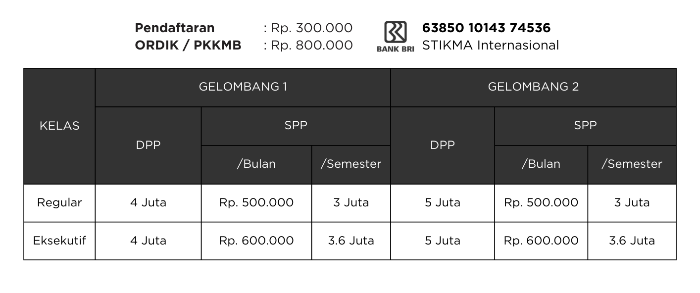 PMB – STT STIKMA Internasional STT STIKMA Internasional membuka pendaftaran tahun ajaran 2026/2027, Gelombang 1 telah dibuka mulai 01 November 2025 – 30 April 2026. PERIODE PENDAFTARAN BIAYA PENDIDIKAN